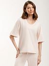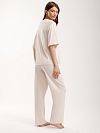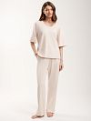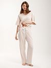 Комплект выполнен из хлопка. Состоит из футболки свободного кроя со спущенными плечами и брюк в свободном силуэте с завязками на поясе.