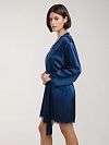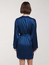 Короткий халат с запахом сшили из струящегося шелка. Слегка укороченные рукава инкрустировали тонким ливерсным кружевом в тон. Изделие фиксируется при помощи длинного пояса-ленты. Образ отлично дополнит сорочка из данной коллекции.