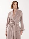 Халат выполнен из мягкого велюра с благородным блеском, который будет как нельзя лучше гармонировать с пижамами и сорочками из струящегося шелка. Классический дизайн, универсальная длина и нежный цвет добавляют изделию элегантности. Выбирайте халат для создания эффектных образов для отдыха дома.