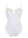 В слитном купальнике с чашкой бандо Вы будете в центре внимания: он не останется незамеченным как на побережье, так и у бассейна. Закрытую спину у модели поддерживает фигурный вырез. Пикантным образ делает золотистая бахрома. Изделие выполнили из плотной эластичной ткани