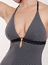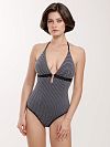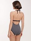 Купальник слитный с V-образным вырезом, съемные чашки, застежка клипсы на спине, классический вырез бедра, окантовка на контрастной ткани.