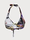 Бюстгальтер с треугольной чашкой имеет съёмные вкладыши. Завязывается на шее и регулируется по объёму с помощью завязок сзади.