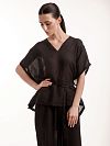 Рубашка из рамии с необычным свободным кроем. Модель сочетается с брюками из той же линейки, создавая гармоничный ансамбль.