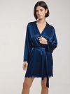 Короткий халат с запахом сшили из струящегося шелка. Слегка укороченные рукава инкрустировали тонким ливерсным кружевом в тон. Изделие фиксируется при помощи длинного пояса-ленты. Образ отлично дополнит сорочка из данной коллекции.