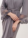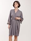 Легкий халат с запахом сшит из гладкого тонкого модала с шелковистой текстурой. На укороченных рукавах с манжетами— широкие вставки из полупрозрачного кружева. Посадка по фигуре удобно регулируется поясом-лентой.