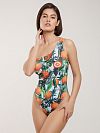 Купальник слитный Мандарины - ассиметричная модель верхней части имеет кармашки для вставных чашек, внутреннюю поддержку груди и силиконовую ленту по верхнему краю изделия.