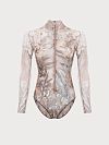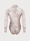 Модель купальника с рукавами и с закрытой спинкой обеспечивает отличную поддержку груди, так как происходит круговое натяжение в данной области. Ткань достаточно упругая, поэтому при правильно подобранном размере получится эффект компрессионного белья. Образ получается подтянутым и подчёркиваются линии тела.