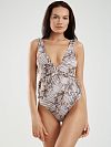 У слитного купальника из линии AWAKENING «Эвэйкенин» восхитительное декольте и элегантный облегающий крой. Принт рептилии играюче расставляет акценты на достоинствах фигуры: окантовка шикарного выреза, вставки под грудью в виде шнурка, делающие вашу талию еще более изящной