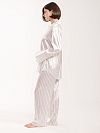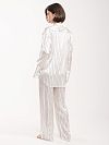 Пижама в полоску состоит из рубашки и брюк, выполнена из вискозы с добавлением шелка. Такой приятный на ощупь материал не электризуется и поддерживает оптимальную для тела температуру, поэтому в рубашке с длинными рукавами и широких брюках будет комфортно во время отдыха. Свободный крой не сковывает движения. Изделия возможно носить не только как домашнюю одежду, но и как костюм для прогулок.