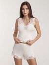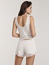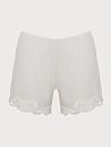 Шорты выполнены из мягкого модала, который хорошо тянется. Брючины украсили тонким цветочным кружевом с фигурными краями. Чтобы вещь комфортно садилась по фигуре и не сковывала движения, ее дополнили потайным узким поясом-резинкой.
