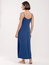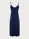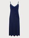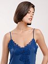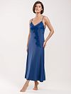 Сорочка на тонких бретелях представлена в длинном варианте. Изделия декорированы от зоны декольте до разреза кружевом в цвет.