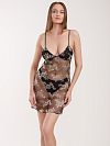 Короткая сорочка на бретелях с вырезом на подоле выполнена черном цвете с золотым жаккардом.