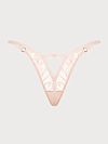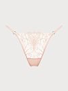 Трусы стринги выполнены из дизайнерской вышивки, созданной по швейцарской технологии. Узор кружева из нити напоминает рисунок пера павлина по телу. Фольгированное напыление создает иллюзию, что полотно усыпано мельчайшими крупинками золотистого песка. В линии ALBA выполнены в жемчужно-розовом цвете. Незаметны под одеждой.