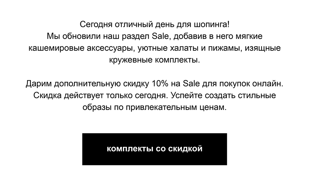 Только сегодня ещё -10% на обновлённый Sale 29 января 2024 Акции Сегодня отличный день для шопинга! Мы обновили наш раздел Sale, добавив в него мягкие кашемировые аксессуары, уютные халаты и пижамы, изящные кружевные комплекты. Дарим дополнительную скидку 10% на Sale для покупок онлайн.