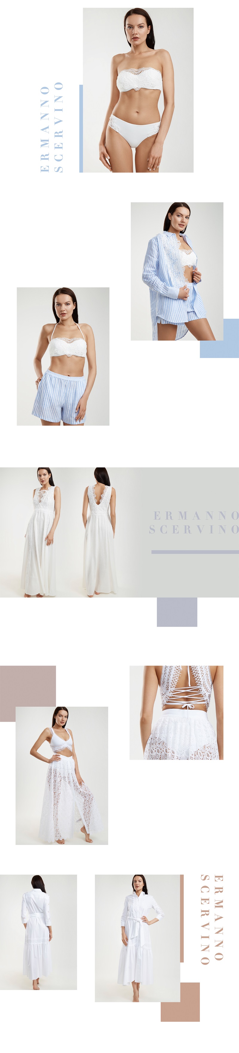 Лето прекрасно в Ermanno Scervino при любой погоде. Коллекции Ermanno Scervino выполнены в лучших традициях итальянской dolce vita. В коллекции Вы найдете изделия, украшенные Валансьенским кружевом, похожим на белоснежное оперение, и непревзойденный крой подчёркивавший всю красоту женщин.